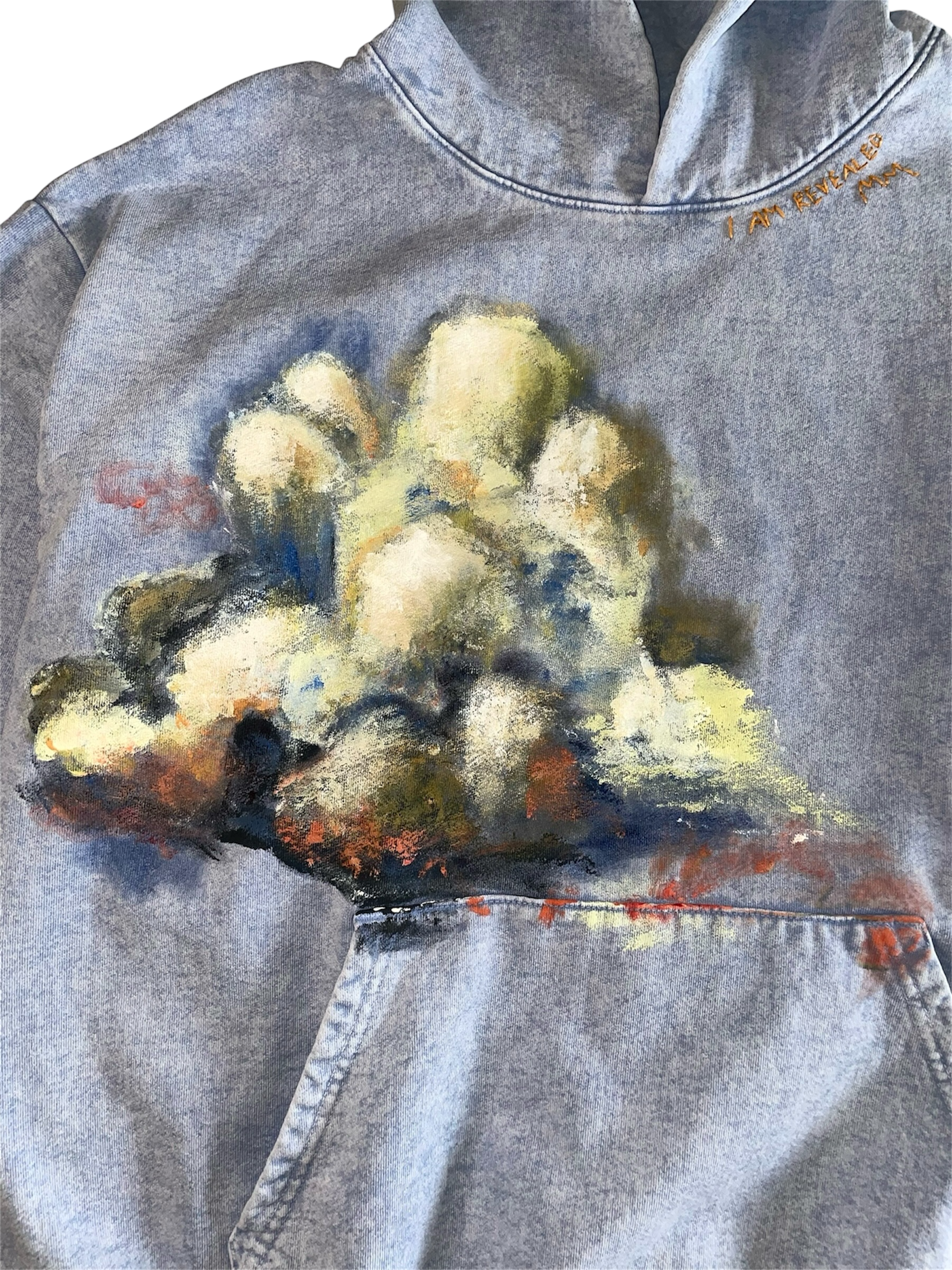 Your hoodie will be hand-painted by artist Makenna Marossy Morales. The featured images for ‘In His Presence’ show the quality and sky-blue colored hoodie you will receive, the general placement of the abstract clouds, and the placement of ‘I AM REVEALED’ hand-stitched to the garment.